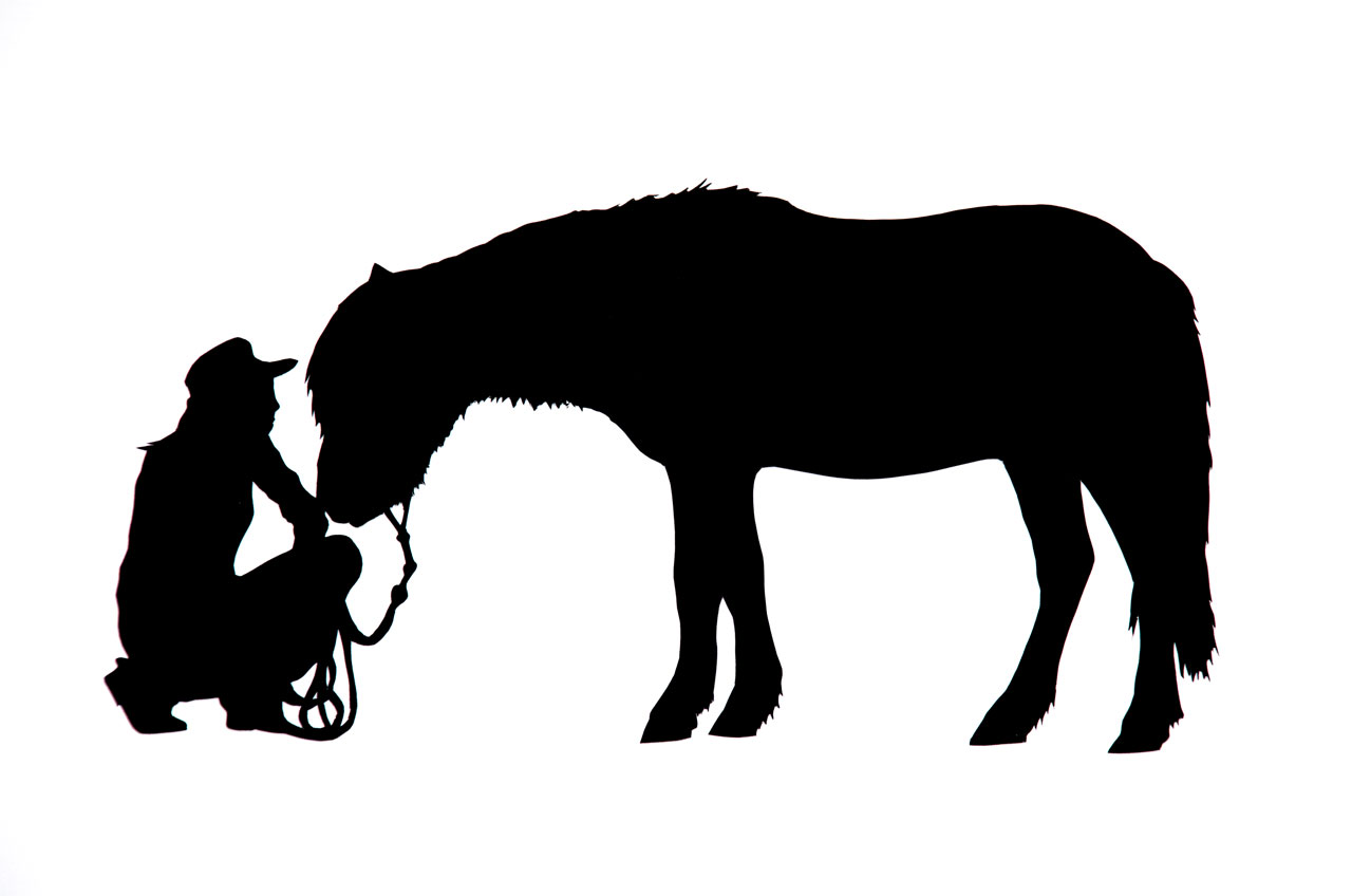 Papierschnitt von einem Islaender und seiner Besitzerin, ganzes Portrait – découpage silhouette d’un cheval islandais et son propriétaire, portrait complet – silhouette paper cutting of an icelandic horse and his owner – horsemanship – étologie